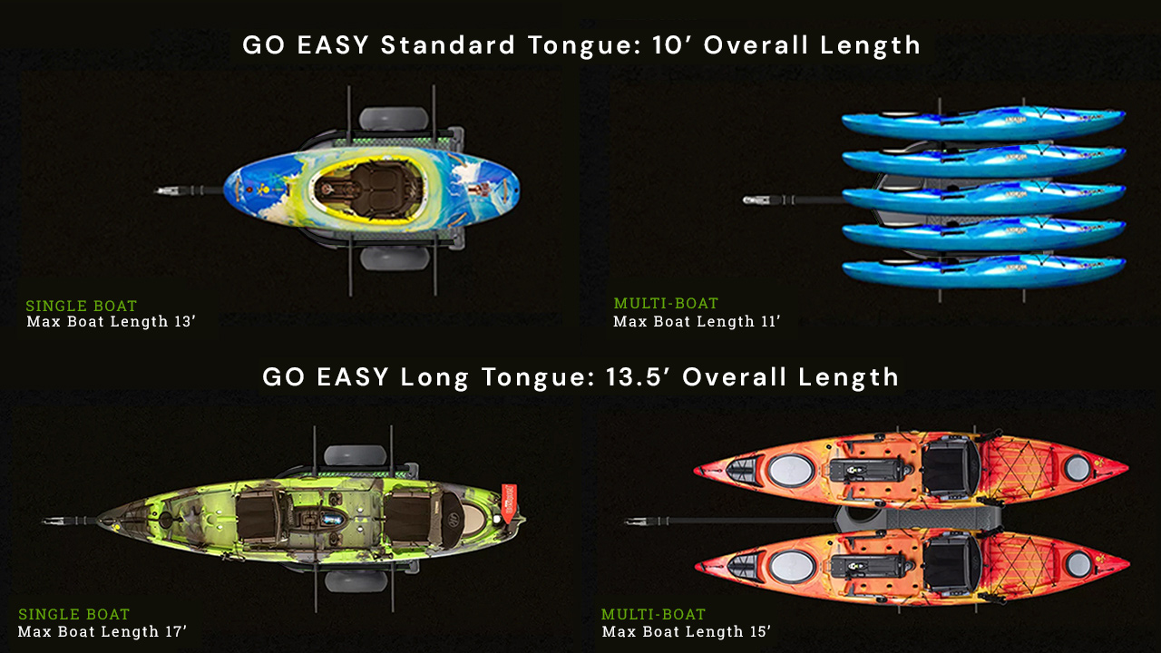 - Not Too Long, Not Too Short: GO EASY comes in at a standard 10′ length, which is perfect for hauling kayaks, SUPs, bikes and gear up to 12′ long. That’s most of us. For those with longer canoes or big sea kayaks, our tongue extension kit lets you carry up to 17′ boats. No reason to pull an extra long trailer if you don’t actually need it.