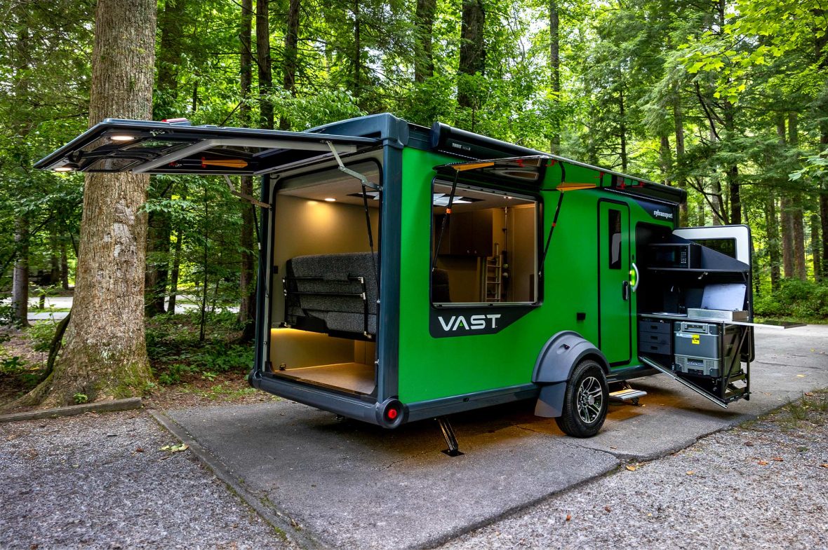 Engineered to counteract any sense of confinement, it features a fully open rear tailgate, expansive windows for natural light and ventilation, and an oversized awning that expands the living area into the outdoors. Furthermore, the VAST includes a patented indoor/outdoor kitchen and two queen beds that comfortably accommodate up to four adults.